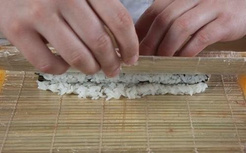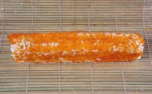 9. посыпать икрой и снова закатать в циновку, чтобы четко прижалось - получится прямоугольная колбаска.