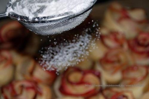 Выкладываем в накладку друг на друга 5 яблочных "Лепестков". Выкладывать надо так, чтобы одна треть "Лепестка" выходила за тесто. Отрезаем излишек теста по длине, оставив запас в один сантиметр. Сворачиваем рулетиком тесто с лепестками. Подгибаем снизу тесто, формируя "низ"бутона". Ставим на противень, застеленный пергаментной бумагой. И в прогретую духовку на 20-25 минут. Как испекутся розочки, достаем, даем охладиться на решетке, посыпаем сахарной пудрой, формируя что-то типа инея.