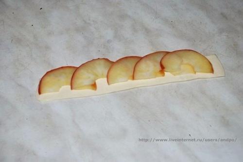 Раскатайте тесто (лучше брать слоенное дрожжевое) в тонкий пласт. Разрежьте его на полоски. Яблоко тонко нарежьте и выложите внахлест на тесто. Сверните ролл и выпекайте в разогретой духовке в течении 25 минут.