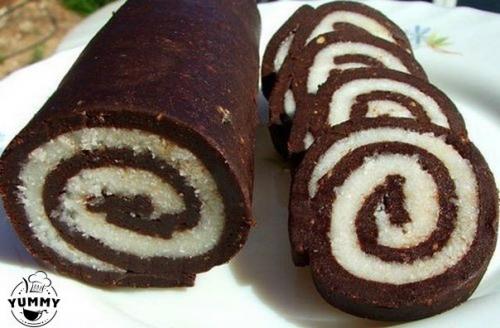 2. сливочное масло взбить с сахарной пудрой и перемешать с кокосовой стружкой. На пищевую пленку выложить смесь из печенья, сверху равномерно распределить кокосовый крем. Свернуть рулет. Убрать в морозильник минимум на 1 час.