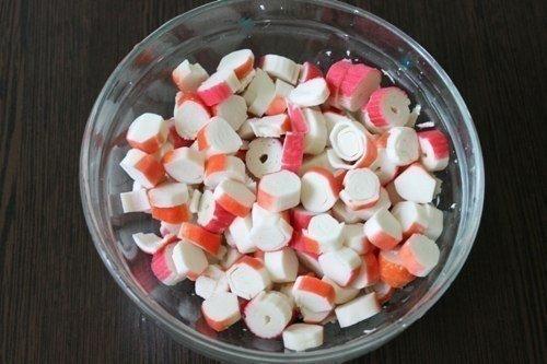 3. крабовые палочки нарежьте кружочками.