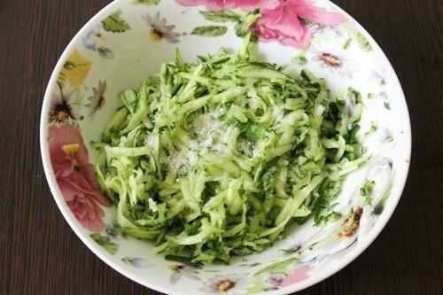 2. промойте свежие огурцы и удалите хвостики. Натрите на крупной терке в емкость. Сразу же всыпьте туда несколько щепоток соли и перемешайте. Соль поспособствует выделению жидкости из огурцов, которую вам через 10 минут необходимо будет слить. В противном случае огурцы выделят жидкость, уже будучи закатанными в рулет, а от нее тесто размякнет.