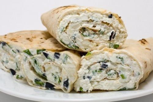 5 на пищевую пленку выложить лаваш, аккуратно смазать творожной смесью.