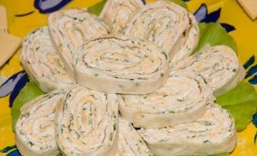 Вслед за ними сразу же обсыпьте весь слой натертым сыром. Сверните все листы лаваша рулетом. Не стоит пытаться свернуть лишь один лист, так как он не будет держать форму, а будет рваться. Сворачивайте сразу три листа вместе. Разрезайте приготовленный рулет сначала посередине на две части, а затем на порции. Его вид изнутри просто потрясающе красочен, а вкус - сочен и нежен! Подавайте закуску с зеленью. Приятного!