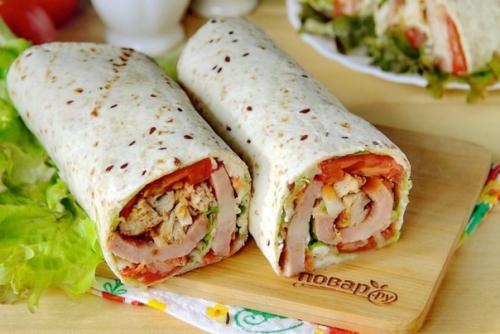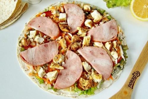 Мы подготовим все ингредиенты. Куриное Филе натрем солью и специями, польем лимонным соком и оставим мариноваться на 20 минут. Затем обжарим с двух сторон в сковороде прикрыв крышкой на умеренном огне до готовности, после чего нарежем кубиками. Капусту тонко нашинкуем, добавим тертую на крупной терке морковь, соль и перец по вкусу. Перемешаем и помнем немного руками, чтобы капуста стала мягче. Ветчину и помидоры нарежем тонкими кружочками, затем каждый кружок еще на две части. В том случае, если у вас один большой лаваш, разрежем его на две части. У меня было два небольших по размеру лаваша. Смажем лаваш сливочным сыром и разложим на нем листья салата. Салат предварительно необходимо промыть и обсушить. На листья салата положим помидоры. На помидоры положим капустную начинку. Сверху положим ветчину и курицу. Таким же образом приготовим второй лаваш. Завернем лаваш с начинкой в рулет. Готовый рулет с сыром и ветчиной можно подать в целом виде или разрезать его перед подачей на 2 или более частей. Приятного аппетита!
