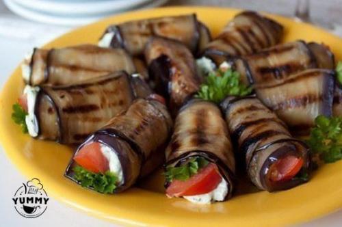 4. на каждый ломтик баклажана кладем по 1 ч. л. Феты, кусочек помидора и половинку грецкого ореха. Сворачиваем в рулетики. Приятного аппетита!