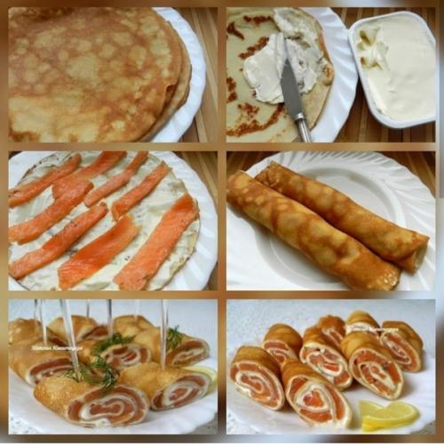 3. свернуть блины, чтобы получились плотные рулеты, убрать в холодильник на 15-20 минут. Приятного аппетита!