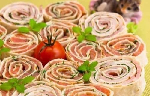 3. лаваш с семгой свернуть в рулет и положить на 10-15 минут в морозилку. Затем достать и нарезать кусочками. Также сделать рулетики с ветчиной.