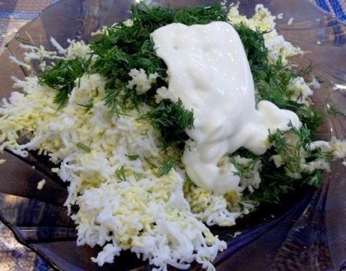 Сыр натрите на мелкой терке. Выложите его в тарелку. Яйца отварите. После чего их почистите. Яйца на мелкую турку натрите. Добавьте их в тарелку к сыру. Нарежьте зелень укропа. Добавьте укроп в тарелку ко всем ингредиентам. Почистите зубчики чеснока и выдавите в тарелку ко всем продуктам
