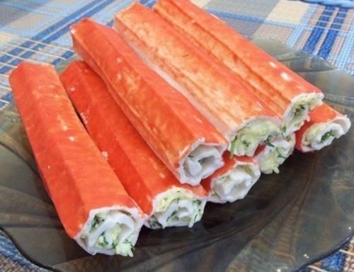 . Добавьте майонез и все тщательно перемешайте. Крабовые палочки возьмите. Снимите с них упаковочную пленку. Раскрутите крабовую палочку. Сверху на неё выложите подготовленную начинку. Затем, аккуратно заворачивайте палочку, как рулет. Рулетики в тарелку складывайте. Когда все рулетики будут закручены, порежьте их и красивенько уложите в тарелку.