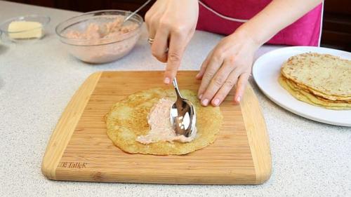 Готовый фарш должен легко размазываться. Распределяем фарш тонким слоем на дранике.
