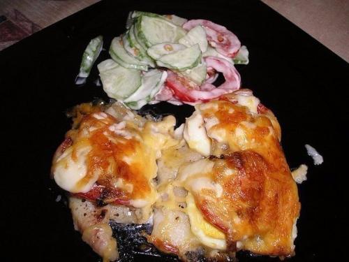 Приготовление: 1. рыбку режем на порционные куски и мы обжариваем на сковородке. 2. аккуратно выкладываем в форму, солим, перчим. 3. варим яйца. Режем кольцами лук, обжариваем его. 4. на кусок рыбки кладем вареное яйцо, порезанное ломтиком. 5. сверху помидорчик. Затем наш лучок. Майонез. Тертый сыр. 6. все ставим в духовку, чтобы сыр расплавился.
