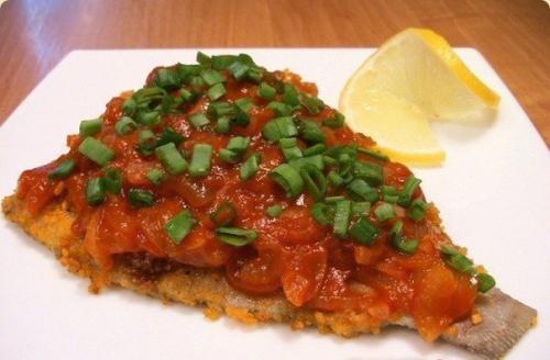 Рыбу тщательно вымыть, затем удалить плавники. Нарезать порционными кусочками, посыпать солью и специями для рыбы. Кусочки рыбы обвалять в муке и обжарить с двух сторон в раскаленной сковороде на растительном масле. Лук и морковь очистить от кожуры, лук мелко нарезать, морковь натереть на крупной терке. Обжарить овощи на растительном масле. Томатную пасту развести кипящей водой, добавить к овощам и тушить около пяти минут. Рыбу отправить к овощам, посыпать специями, добавить лавровый лист, соль и смесь молотых перцев. Тушить рыбу 20-25 минут. Скрыть текст.