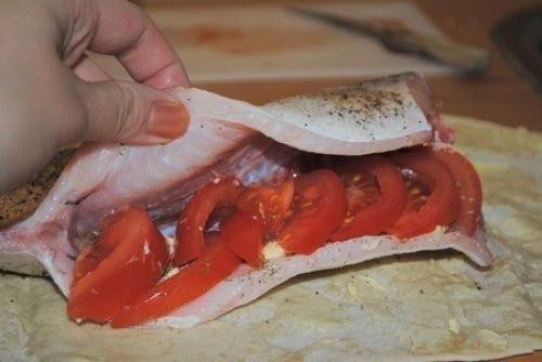 6. также во внутрь брюшка кладем дольки помидора и укроп. Лучше использовать свежий укроп (его можно положить прямо пучком или мелко порезать. Лишь в том случае, если вы используете свежий укроп - то кладите его больше - вкус только улучшится. В принципе можно добавить и петрушку для аромата.