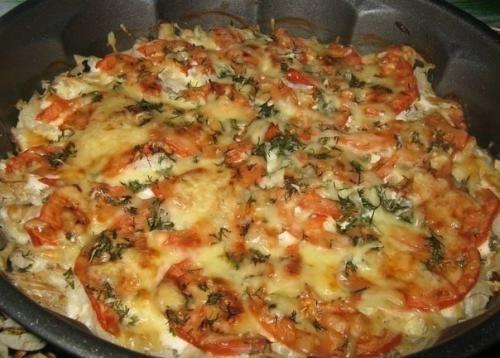 3. сверху смазать сметаной. Помидор тонко нарезать полукольцами, выложить следующим слоем.