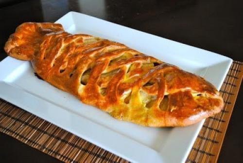 Распределяем на тесте слой лука в центре, ближе к одному из узких краев овала. На лук укладываем рыбное Филе. Вокруг начинки делаем надрезы так, как показано на фотографии. Начинку полосками теста по типу "Косички оплетаем". "Рыбий Хвост" оставляем незагнутым. Перекладываем на закрытый фольгой и смазанный маслом противень. Ставим в разогретую до 190 с духовку на 25 - 30 минут. В середине процесса смазываем пирог яичным желтком. Вынимаем из духовки и оставляем на 10-15 минут, прикрыв полотенцем.