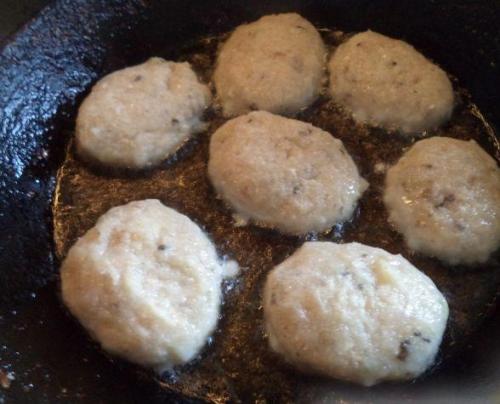 Разогреть сковороду, налить растительное масло. Мокрыми руками сформировать котлеты. Обвалять в муке и выложить в горячее масло.