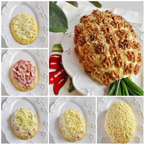 Подготовленные ингредиенты на овальное блюдо слоями выкладывать.