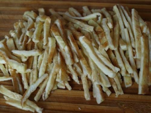 Ветчину нарезать соломкой, нашинковать пекинскую капусту. Сложить в миску. Нарезанную курицу и блинчики добавить.