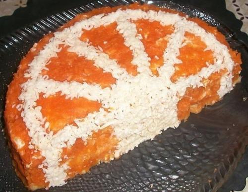 Нарезать кубиками маринованные огурцы, также смазать их майонезом. Сварить морковь, натереть её на мелкой тёрке. Выложить морковью внешнюю сторону дольки. Всю остальную часть покрыть натёртым твёрдым сыром и сделать морковью сегменты.