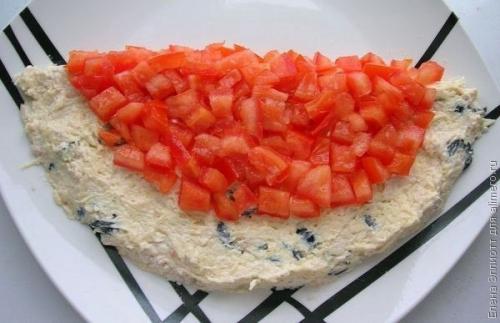 Выкладываем салат в форме арбузной дольки на большое плоское блюдо.