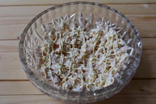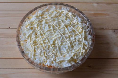 Второй слой - морковка по-корейски, сверху - сеточка из майонеза.