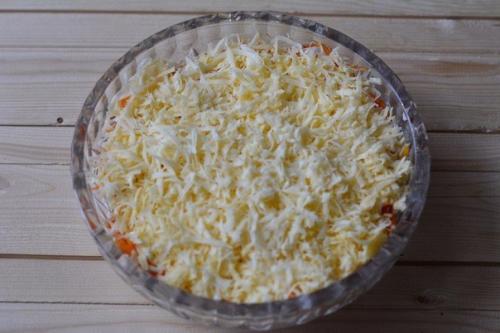 Сыр натереть на мелкой терке и выложить третьим слоем.