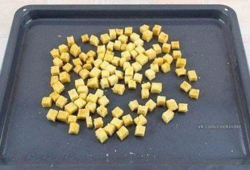 Сначала мы подготовим чесночные сухарики. Зубчик чеснока почистить, раздавить плоской стороной ножа. Положить его в небольшую емкость, залить 2 ст. л. оливкового масла. Поставить в микроволновку на 20-40 секунд. Благодаря этому масло и чеснок подогреется, в результате чего чеснок отдаст свой аромат маслу. С батона срезать корку, порезать хлеб небольшими кубиками. Разложить на противне, равномерно полить полученным маслом, перемешать. Поставить в разогретую до 150 градусов духовку. Готовить 20-40 минут, до легкой золотистости. Готовые сухарики остудить. Подготовим заправку. Яйца отварить в течение 5 минут с момента закипания. Охладить, залив холодной водой, затем отделить белки от желтков. Желтки, горчицу и чеснок, выдавленный через чеснокодавилку, тщательно растереть.