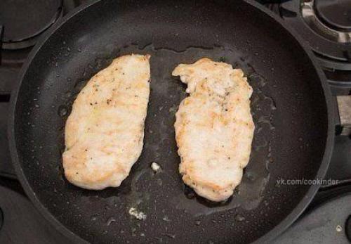 Добавить лимонный сок, маленькую щепотку соли, перемешать. Постепенно добавить оливковое масло, постоянно перемешивая. На этом этапе заправка еще может быть не полностью однородная. Оставьте ее на время постоять. Куриное Филе разрезать вдоль на два тонких пласта. Посолить, поперчить. На сковороде разогреть примерно ложку оливкового масла. Выложить Филе, жарить на среднем огне 4-5 минут. Перевернуть на другую сторону, жарить еще 4-5 минут.