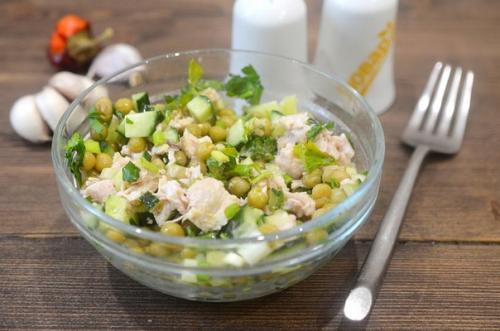 5. добавьте горошек, все перемешайте. 6. посолите, добавьте заправку. Приятного аппетита!