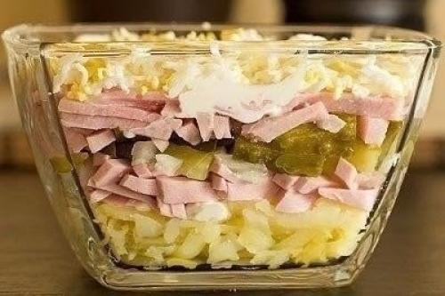 Режем соломкой вареную колбасу. Обмазываем заправкой. Мелко режем лук. Выкладываем.