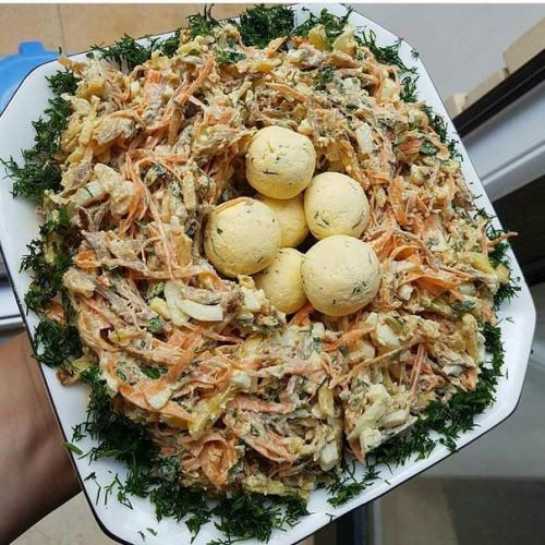 Все ингредиенты смешать с добавлением майонеза и чеснока для аромата, разложить на тарелочке в форме гнезда, в середину положить шарики из желтков, по краю для красоты посыпать зеленью.