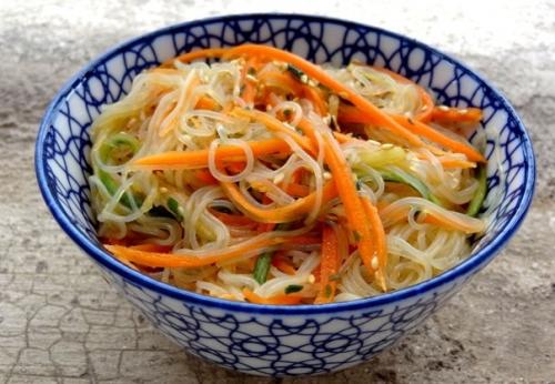Салат из фунчозы с овощами и соусом.