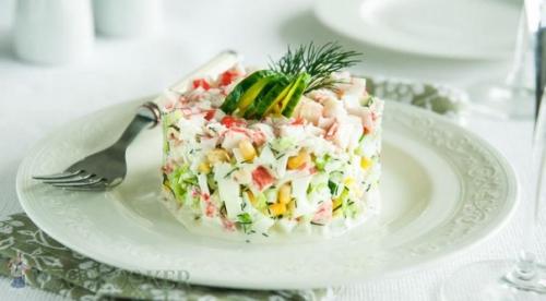 Огурцы и крабовые палочки мелкими кубиками нарежьте.