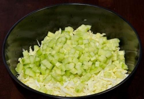 3. нарежьте кубиками огурец (если кожица жесткая - удалите ее) и добавьте в салатник.