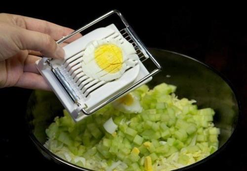 4. очистите и нарежьте яйца, добавьте в салатник.