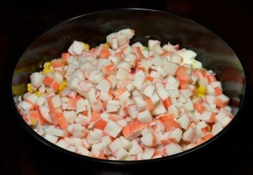 5. нарежьте крабовые палочки небольшими кусочками и также добавьте в салатник.