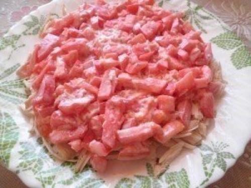 6. огурцы порезать маленькими кубиками и выложить следующим слоем.