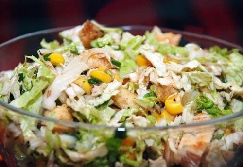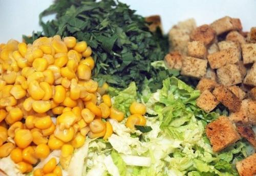 4. туда же добавьте кукурузу, измельченную зелень и сухарики. Мелко нарежьте луковичку.