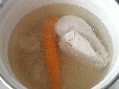 1. ставим отваривать куриное Филе (для аромата мы добавляем морковку, репчатый лук и лавровый лист. Бульон мы потом для супа использовали.
