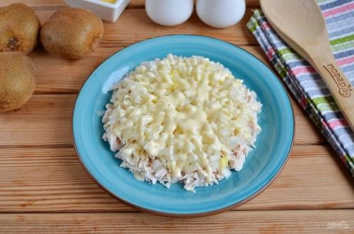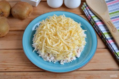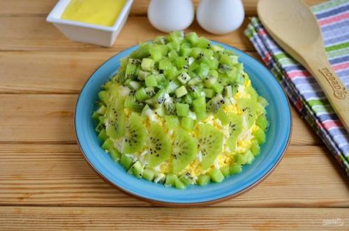 8. и последний слой - порезанные кубиками киви. Салат салат отправьте в холодильник на часик для пропитки. приятного аппетита!