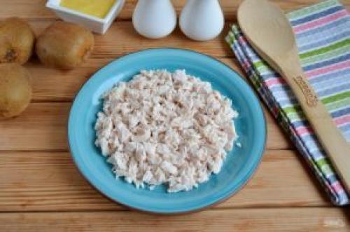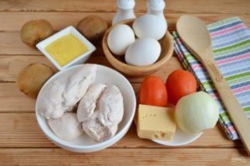 1. подготовьте продукты для салата. Отварите куриное Филе в соленой воде. Отварите яйца, остудите и снимите скорлупу. Помидоры. Приступим!приступим! . куриное Филе порежьте небольшими кубиками, кусочками, как получится. Уложите уложите равномерно на блюдо. . очистите луковицу, порежьте её максимально мелко и распределите равномерно по куриному мясу.