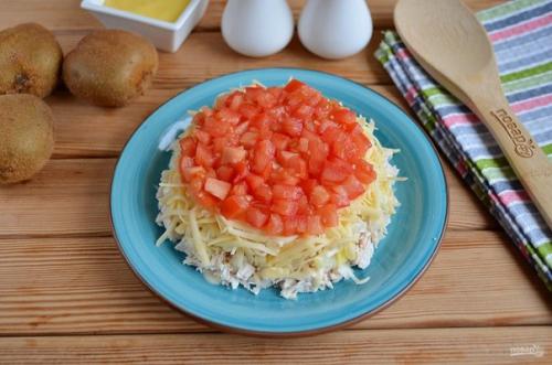 4. сделайте щедрую майонезную сеточку. Соль соль и перец - по вкусу. . далее - слой тертого сыра. Используйте используйте крупную терку. . помидоры порежьте небольшими кубиками. Распределите распределите их по сырному слою. . следующий слой - тертые яйца и майонез.