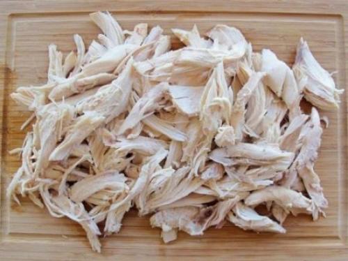 Куриное Филе отварить, остудить, разобрать на волокна.