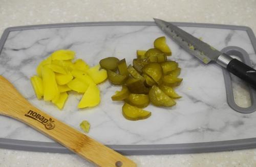 2. картошку почистите и нарежьте вместе с огурцами мелким кубиком.