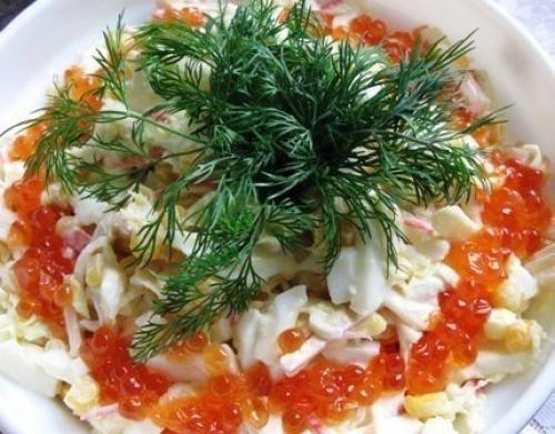 Яйца, крабовые палочки, кальмар и лосось мелко нарезать соломкой, капусту нашинковать. Все смешать, добавив кукурузу и майонез. Выложить в салатницу, украсить икрой. Приятного аппетита!