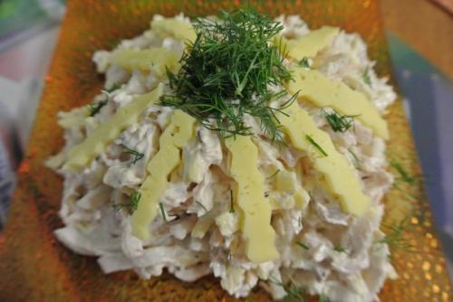 Куриная грудка - 400 г. Кальмары - 300 г. Сыр - 100 г. Майонез - 200 г. Соль, перец - по вкусу. Способ приготовления. Шаг 1 отварить куриную грудку в подсоленной воде и разобрать на волокна. Шаг 2 кальмары отварить 3 минуты, почистить и нарезать соломкой. Шаг 3 сыр нарезать соломкой. Шаг 4 все соединить, посолить - поперчить, заправить майонезом. Шаг 5 украсить ломтиками сыра и зеленью укропа. Приятного аппетита!