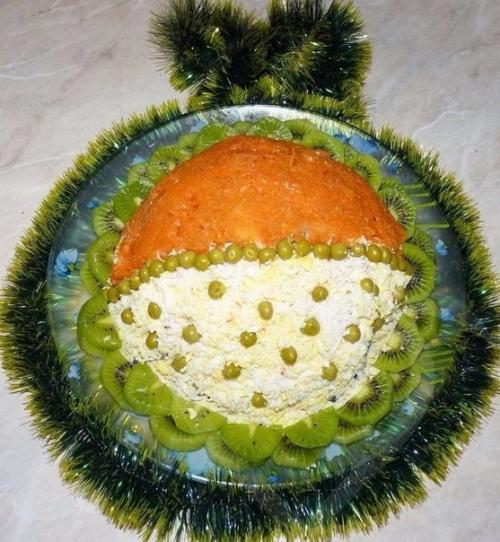 Форель и авокадо мелко нарежьте. Натрите на терке сыр и белок одного яйца. Добавьте плавленый сыр, перемешайте. Солить салат не надо. Выложите салат на тарелку в виде двух шаров. Сверху покройте один шарик натертым белком, другой - тонкими ломтиками рыбы. Вырежьте звездочки или же просто кружочки из твердого сыра и форели, украсьте ими салат. Веточку елки из укропа или же морской капусты выложите. Снежинки из кетчупа и майонеза нарисуйте.