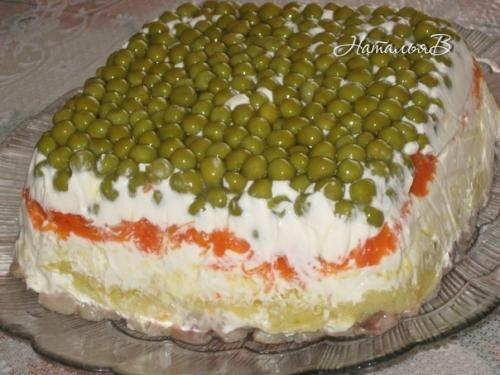 В салатницу выложить слоями: скумбрия (майонез) - картофель на мелкой терке (майонез) - морковь на мелкой терке (майонез) - яйца на мелкой терке (майонез) - зеленый горошек. Салат в холодильник на 2-3 часа для пропитки поставить. Приятного аппетита!