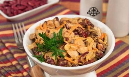 - 1 банка консервированной фасоли (только не в томате), - 2 помидора, - 50 гр. петрушки, - 50 гр. Копченой колбасы, - 50 гр. сыра, - 2 ст. Ложки майонеза.